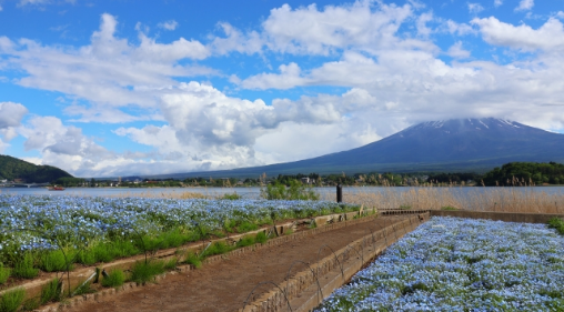 富士山を正面に望む、河口湖北岸の人気絶景スポット。四季折々の花々と富士山のコラボレーションが楽しめる、フォトジェニックな公園です。春はチューリップや芝桜、夏はラベンダーが見頃を迎え、秋には紅葉との美しいコントラスト、冬は澄んだ空気と雪化粧の富士山が堪能できます。